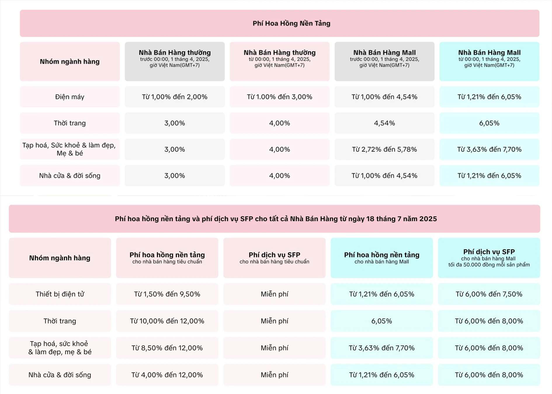 Nền tảng cũng tập trung vào nhóm nhãn hàng thương hiệu, có đăng ký chức năng Mall (chính hãng). Những tài khoản này có biểu phí hoa hồng thấp hơn một nửa, được quyền chọn có mua dịch vụ SFP hay không. TikTok Shop cho biết họ cũng giảm phí VXP (Voucher Extra) cho người có đăng ký. Tuy nhiên, mức thay đổi cụ thể không được công bố.